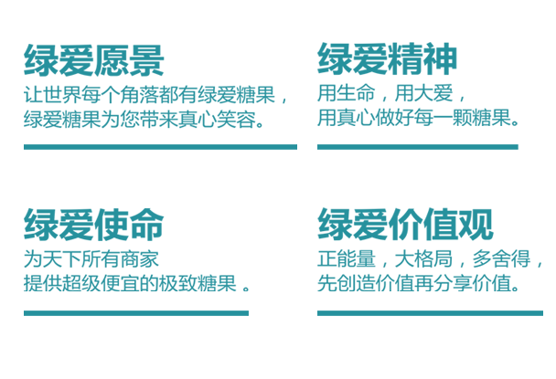 綠愛(ài)糖果堅持“讓世界每個(gè)角落都有綠愛(ài)糖果、綠愛(ài)糖果為您帶來(lái)真心笑容”的企業(yè)愿景,以“為天下所有商家提供超級便宜的糖果”為使命,首創(chuàng )了“個(gè)性化定制+互聯(lián)網(wǎng)+大數據+精準傳媒”的商業(yè)模式,在國內率先實(shí)現了個(gè)性化定制的工業(yè)化生產(chǎn),實(shí)現了1箱起定、24小時(shí)交貨的“負庫存”定制生產(chǎn)模式,服務(wù)于汽車(chē)、地產(chǎn)、銀行、航空、金融、餐飲、酒店、休閑、娛樂(lè )、婚慶等40余個(gè)行業(yè),十萬(wàn)家客戶(hù)。