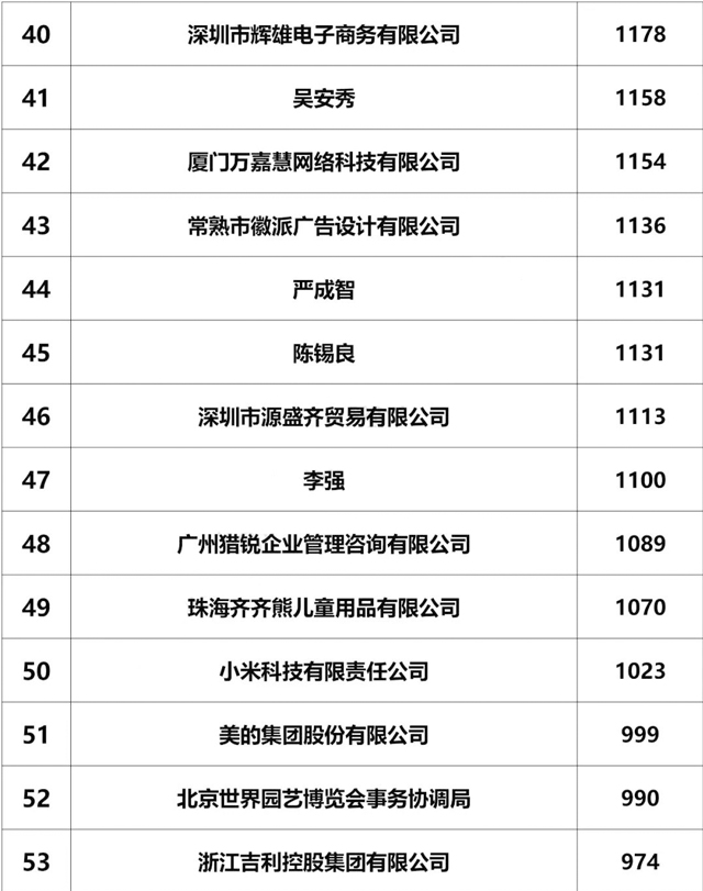 截止2018年6月30日,山東綠愛(ài)糖果股份有限公司,商標申請1289個(gè),,全國排名第35位,山東省排名第1位!