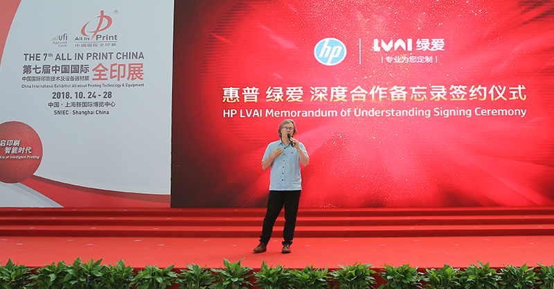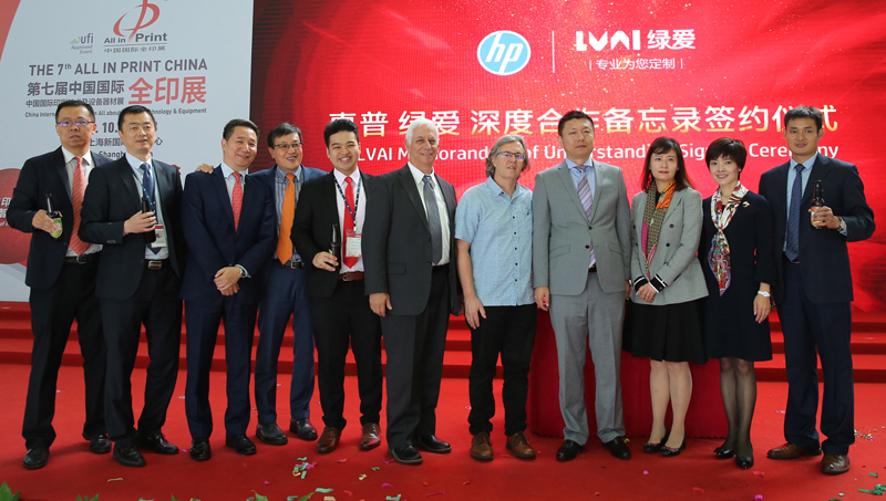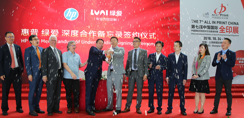 簽約儀式在上海新國際博覽中心2018中國國際全印展現場(chǎng)舉行,綠愛(ài)股份董事長(cháng)郭建波先生、技術(shù)學(xué)院顧問(wèn)Simon Wang;綠愛(ài)股份董事,運營(yíng)總監王學(xué)龍先生;綠愛(ài)股份董事,新業(yè)務(wù)總監孫士鑫先生;綠愛(ài)股份監事,市場(chǎng)總監方桂林先生?;萜展綢ndigo數字印刷業(yè)務(wù)部副總裁兼總經(jīng)理Alon Bar-Shany先生、惠普Indigo數字印刷事業(yè)部中國區總經(jīng)理李鵬先生出席現場(chǎng)。